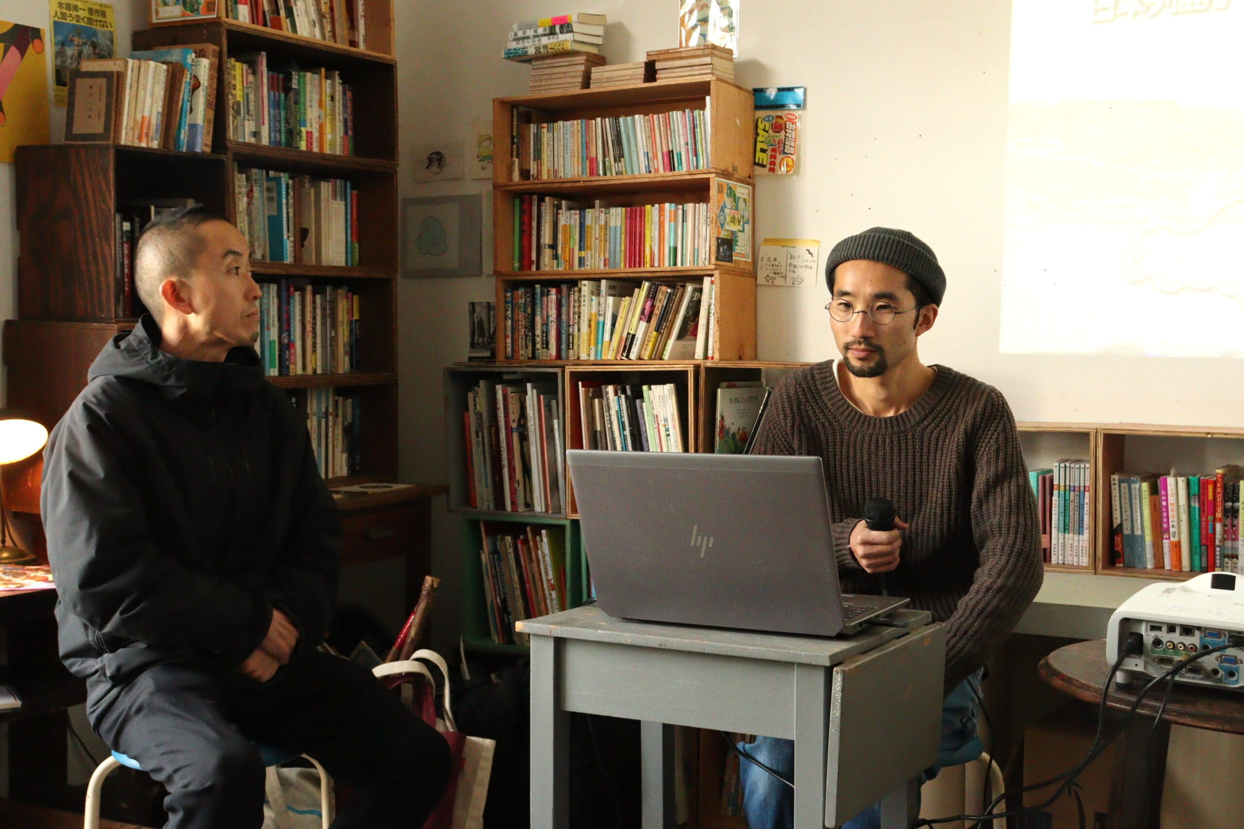 多彩なトークを繰り広げる横山さん(右)と賀儀山さん=岡山県津山市で