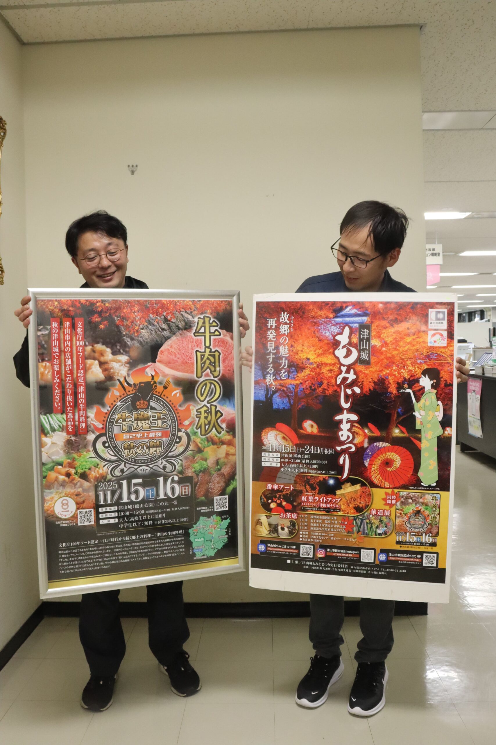「津山城もみじまつり」のポスターを手にPRする市観光協会の職員=岡山県津山市で同時開催されるイベント「牛魔王秋の陣」と併せてPRする関係者