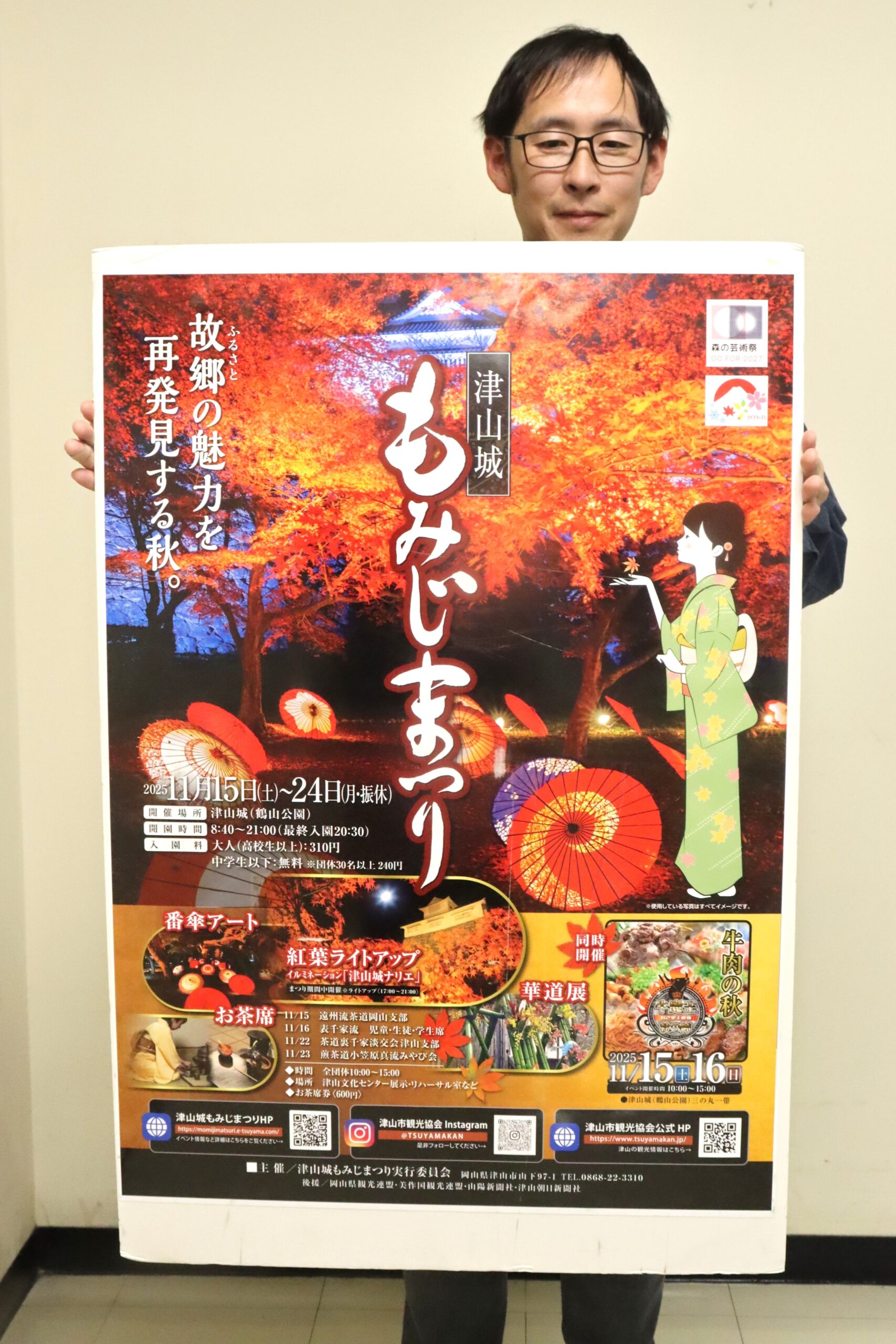 「津山城もみじまつり」のポスターを手にPRする市観光協会の職員=岡山県津山市で