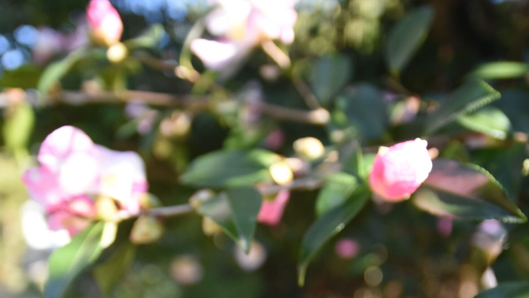 ほころぶサザンカのつぼみ 二十四節気「小雪」 庭園に柔らかな彩り/岡山・津山市