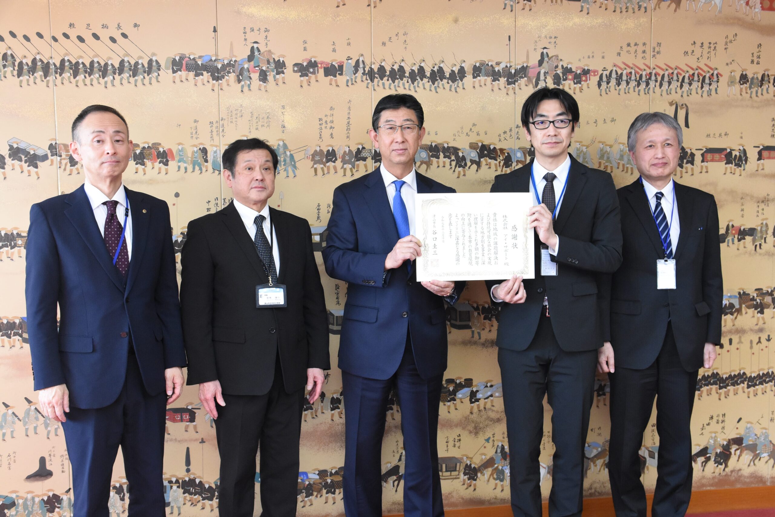昨年に続き2回目の寄付を行ったアイ・サポートの長澤順社長ら有本教育長から感謝状を受け取る長澤社長=岡山県津山市で