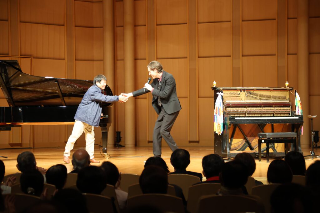 ステージには広島の原爆で損傷しながら残った「被爆ピアノ」がグランドピアノと並んで置かれ、コーラーさんは、2つのピアノを行き来しながら、荒城の月、Spain、ピアノ・マン、戦場のメリークリスマス、ジブリ作品や童謡など幅広い曲目を披露。ジャズピアニストならではの柔らかいタッチと豊かなアレンジで会場を魅了した。