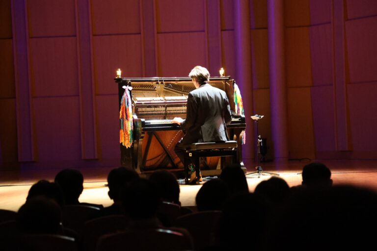 ステージには広島の原爆で損傷しながら残った「被爆ピアノ」がグランドピアノと並んで置かれ、コーラーさんは、2つのピアノを行き来しながら、荒城の月、Spain、ピアノ・マン、戦場のメリークリスマス、ジブリ作品や童謡など幅広い曲目を披露。ジャズピアニストならではの柔らかいタッチと豊かなアレンジで会場を魅了した。