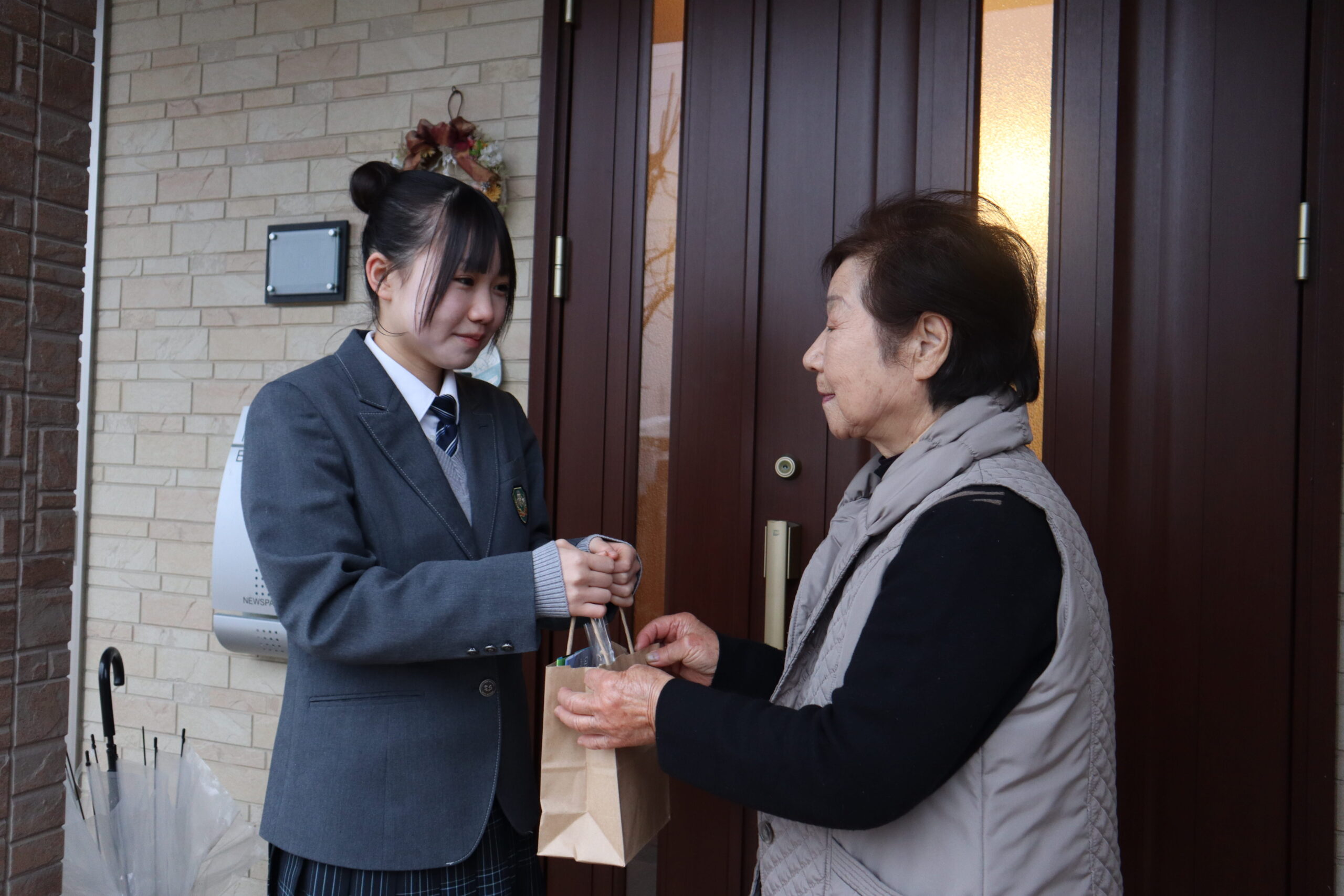 堀坂の高齢者を訪ねた津山東高校の生徒高齢者宅に贈る手作りの菓子感謝の気持ちを込めてプレゼントを手渡す津山東高生=岡山県津山市東一宮で