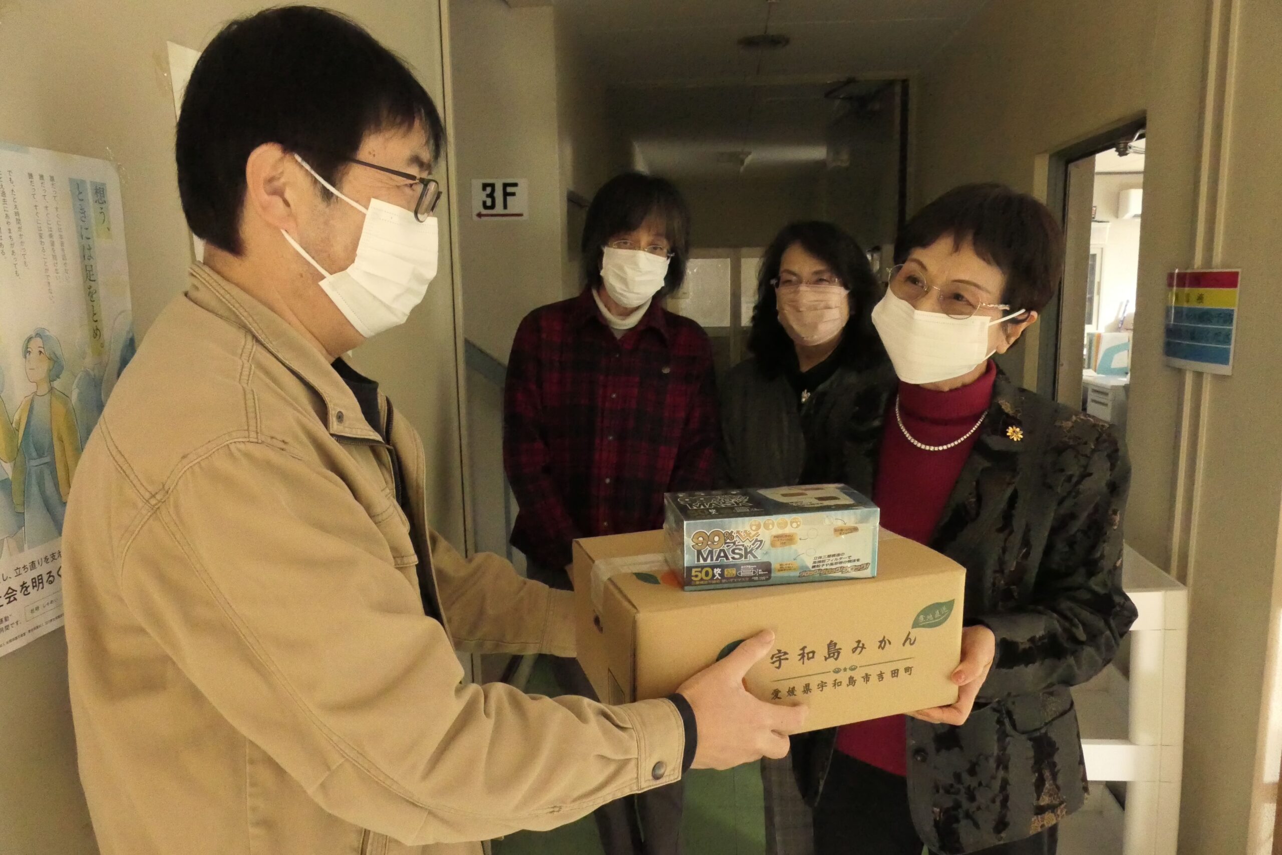 寄贈品を手渡す津山地区更生保護女性会の役員=岡山県津山市で