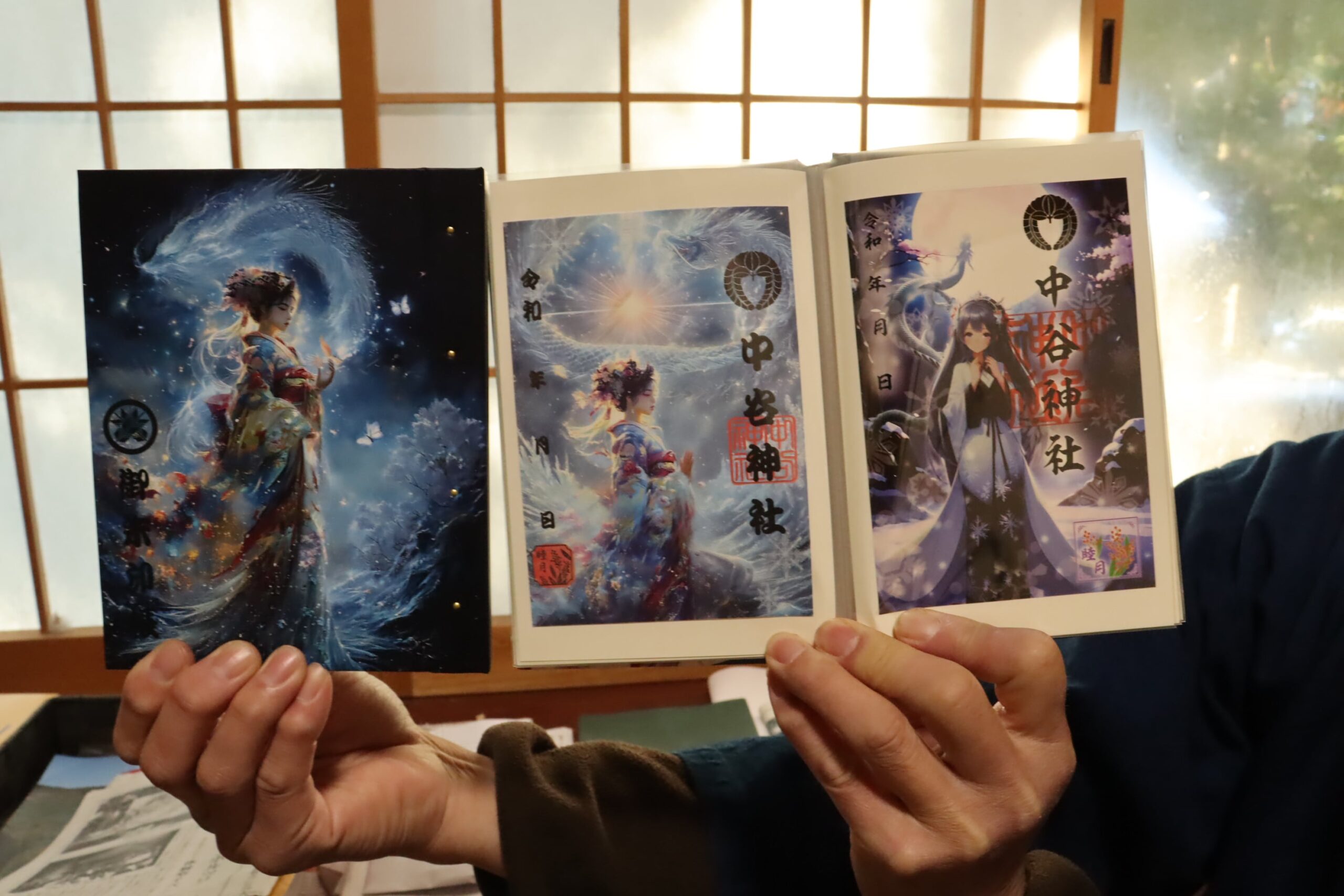 中谷神社の新作の御朱印帳(左)と限定御朱印=岡山県鏡野町で