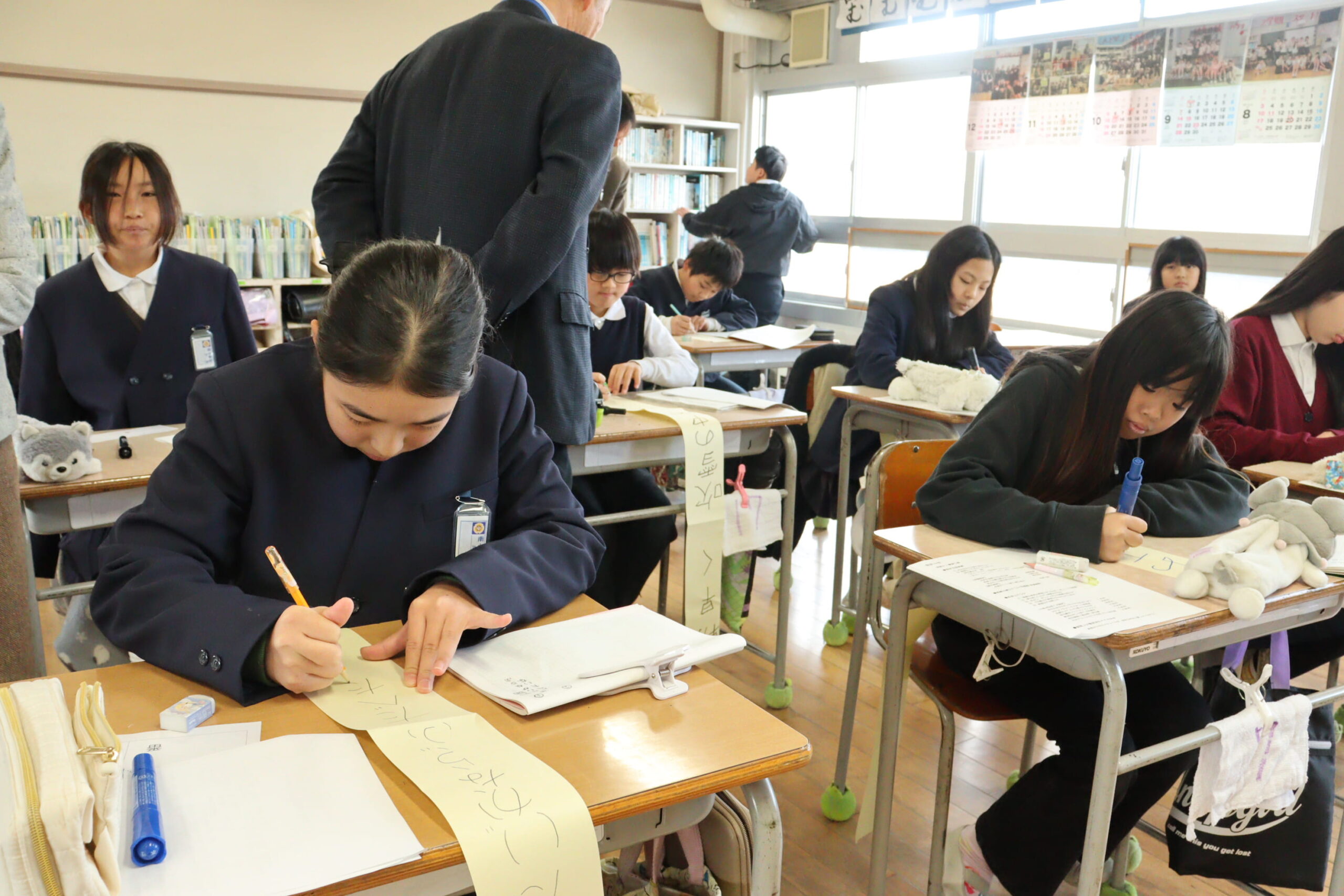 俳句作りに挑戦する児童たち=岡山県津山市で