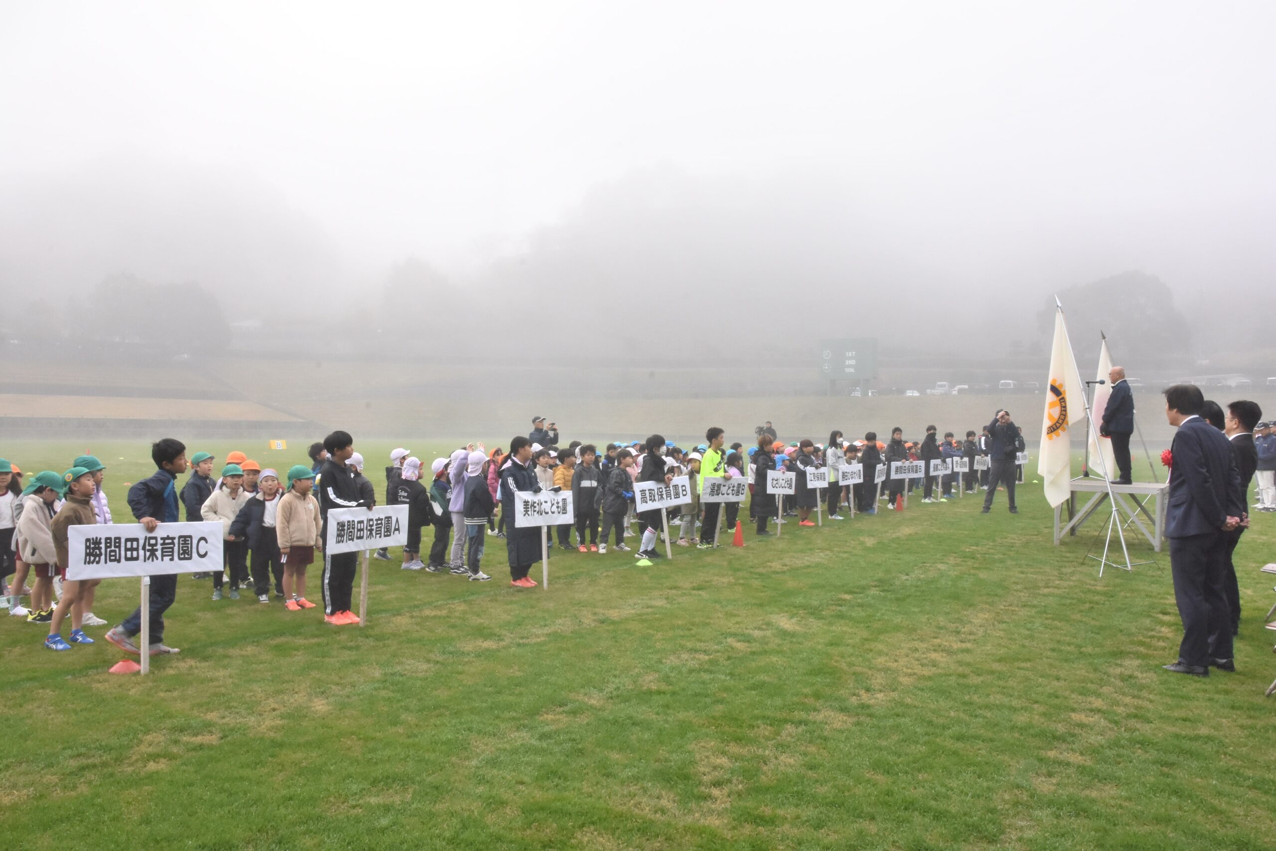 開会式で中尾会長のあいさつを聞く園児たち元気いっぱいにボールを追いかける子どもたち=岡山県美作市で