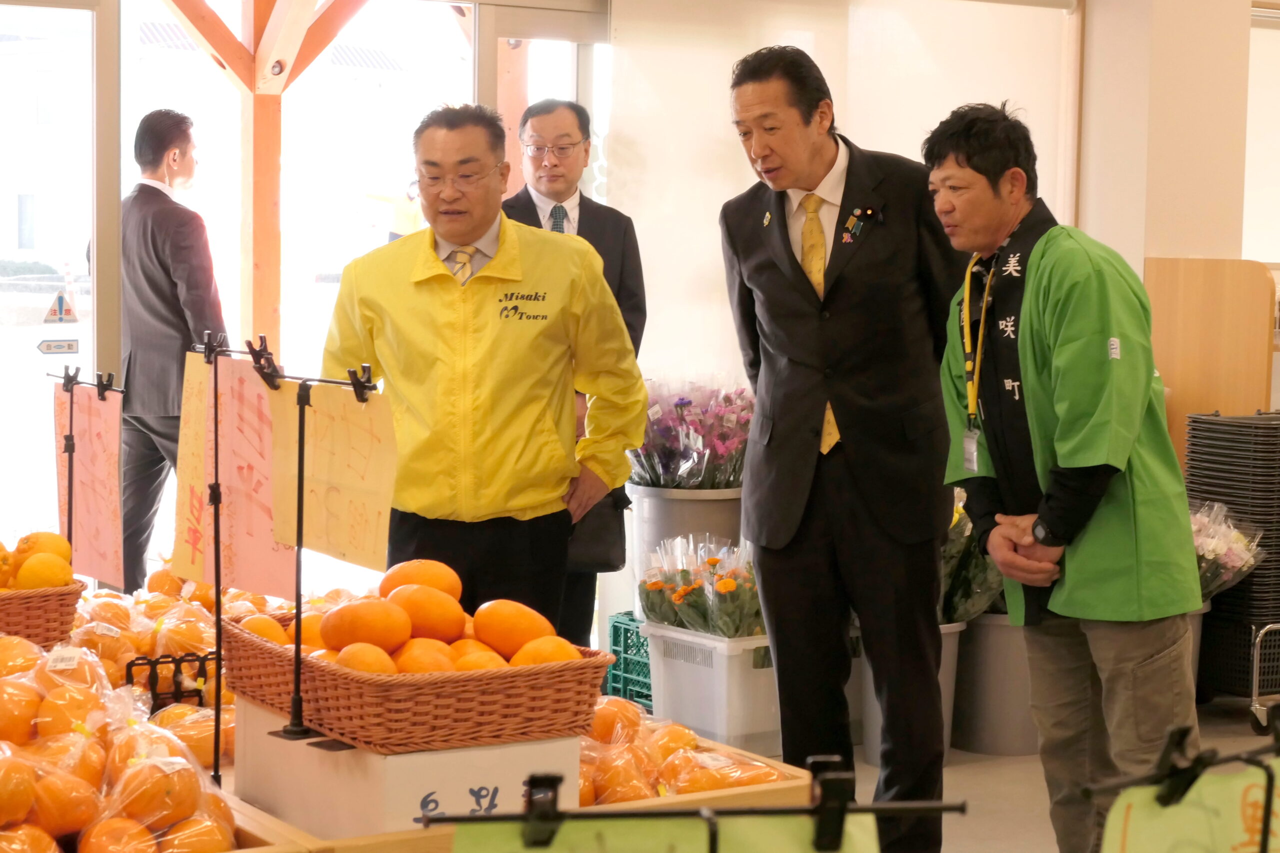 美咲町物産センターを見学する黄川田大臣(右から二番目)=岡山県美咲町で