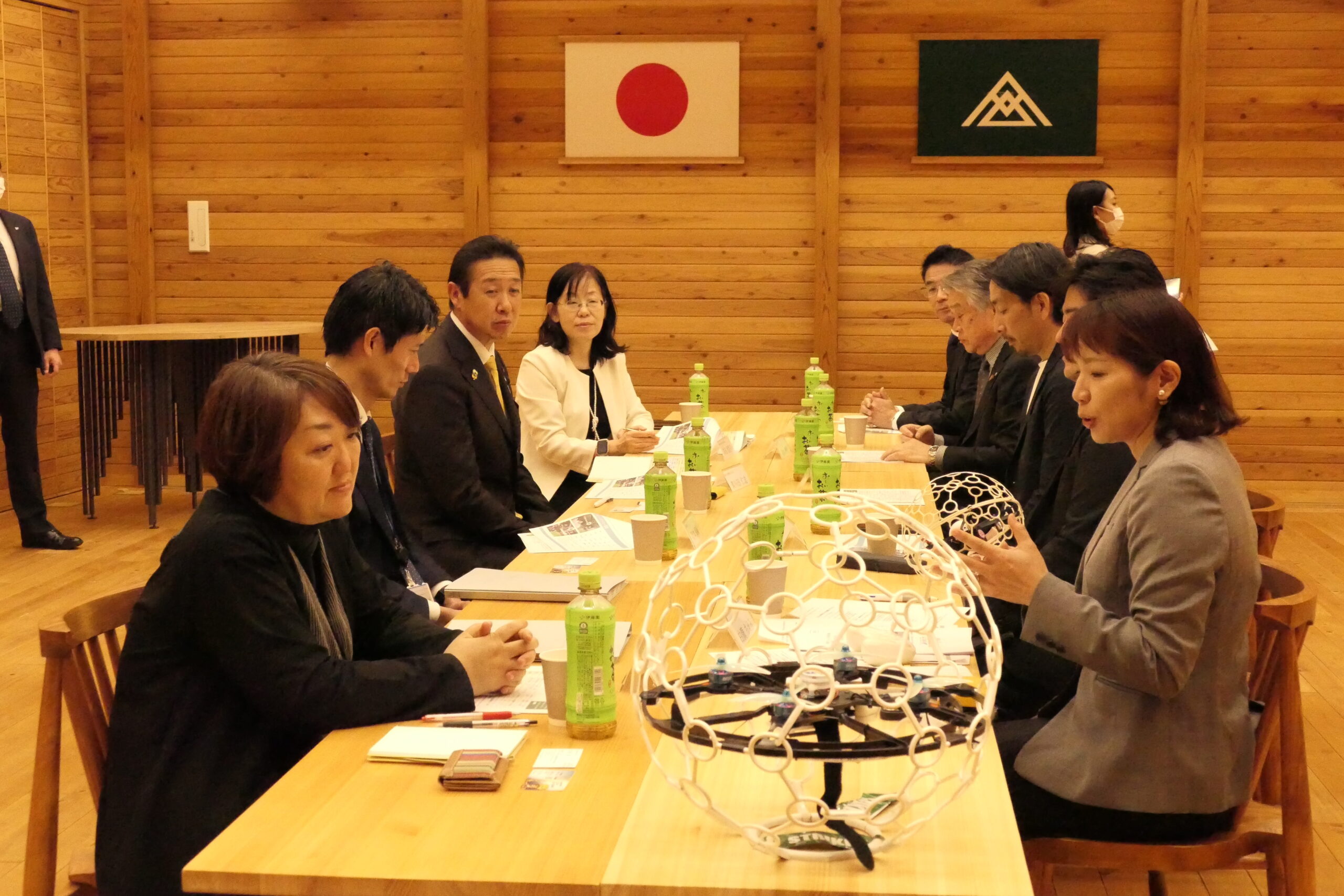 西粟倉村のローカルベンチャー企業から話を聞く黄川田大臣(左奥から二番目)=西粟倉村、あわくら会館で