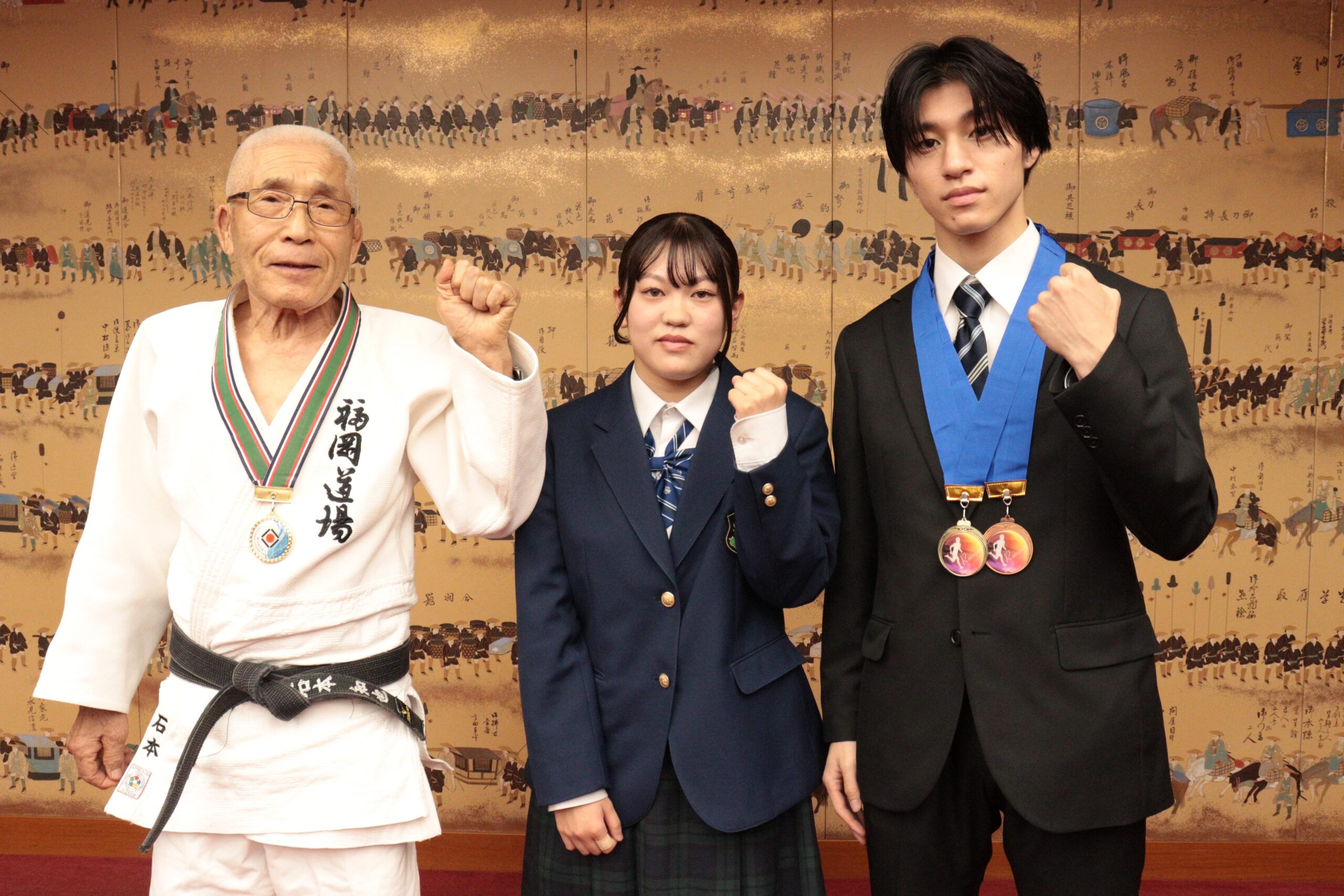 全国、国際大会で快挙を達成した選手3人=岡山県津山市で