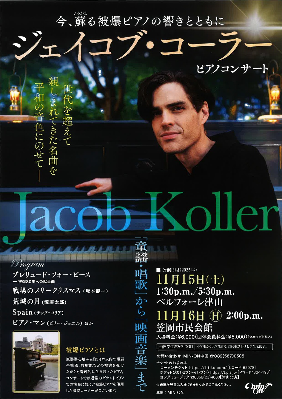 平和への願い ジェイコブ・コーラーさん被爆ピアノ演奏 調律は矢川光則さん/岡山・津山市、笠岡市