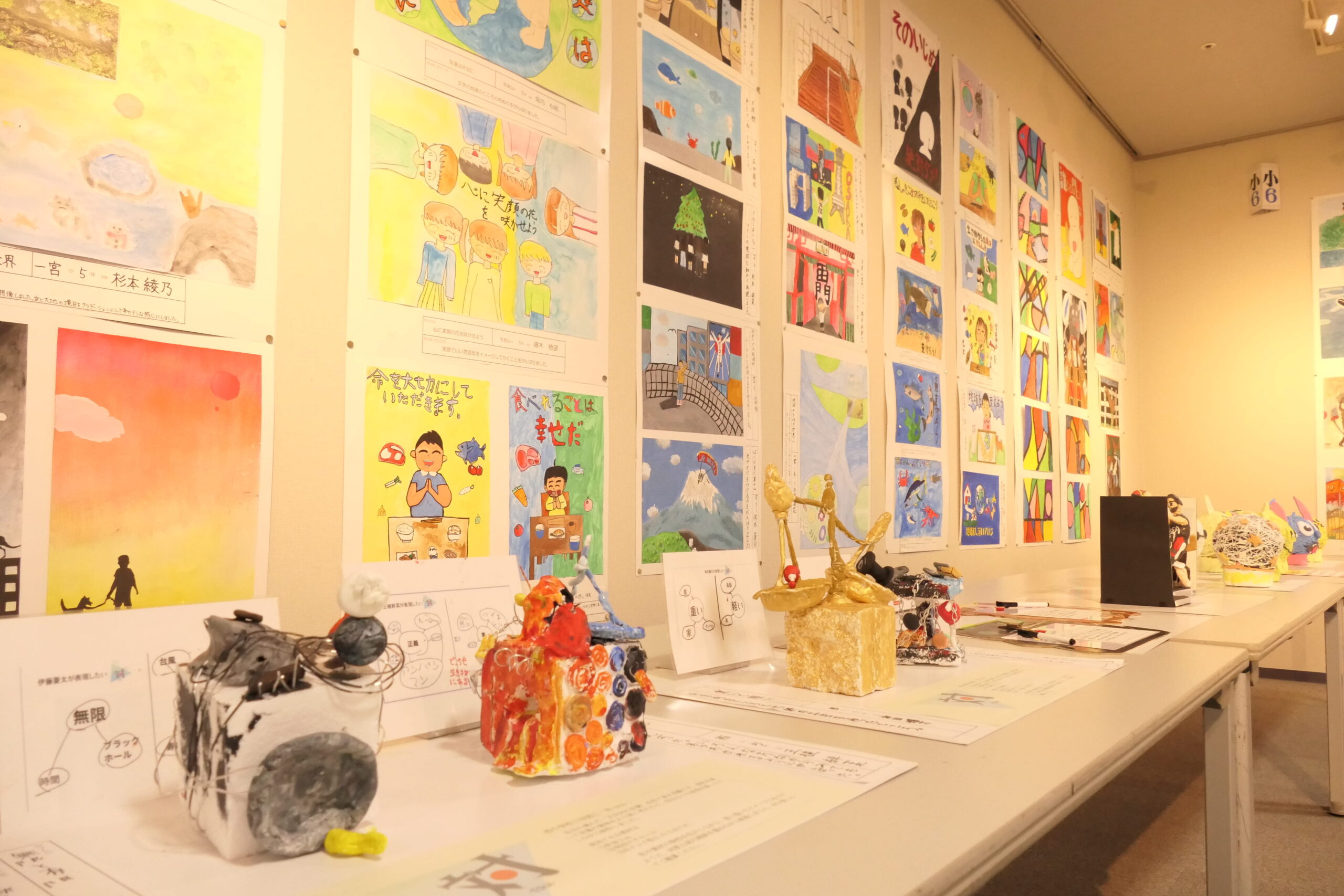 想像力を働かせて作った意欲作の数々子どもたちの個性光る力作が並ぶ会場=岡山県津山市で