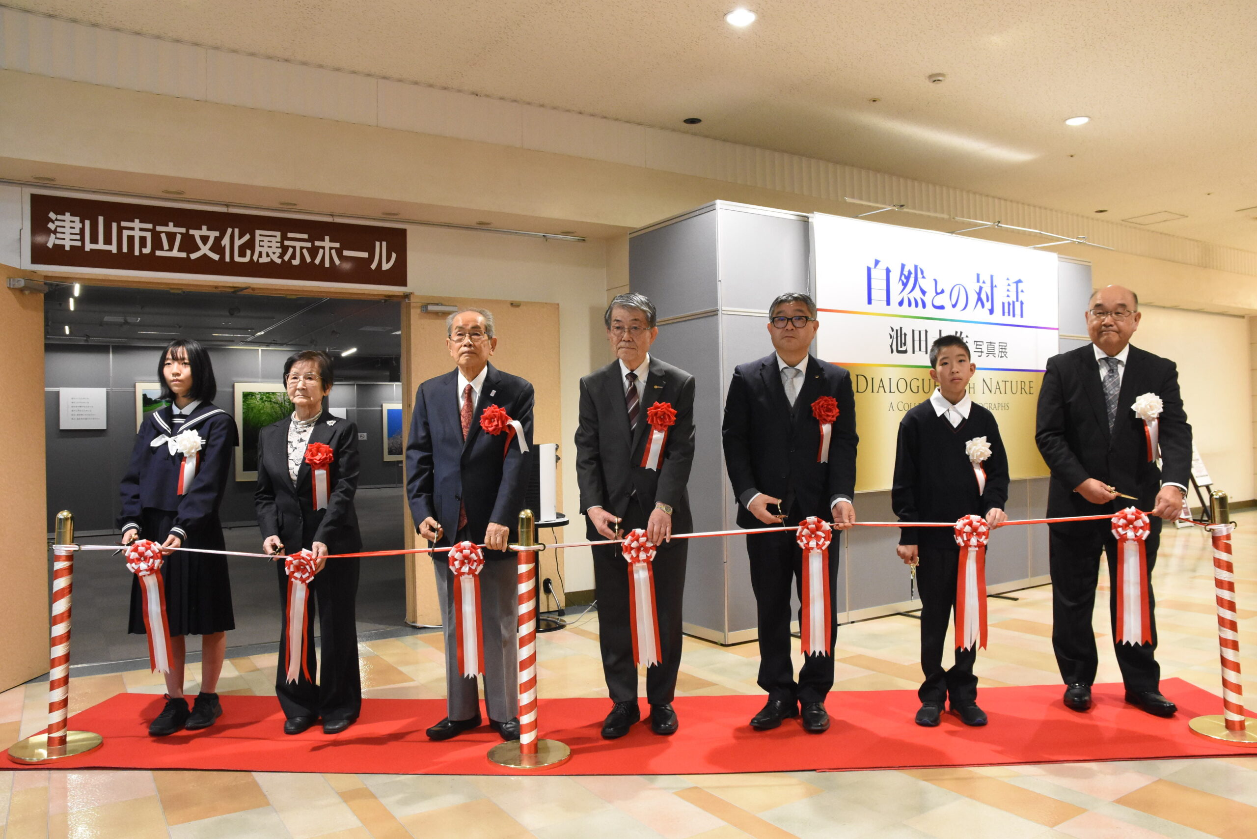 世界各地の自然や風景を捉えた池田大作氏の写真展=岡山県津山市でテープカットで祝う参加者