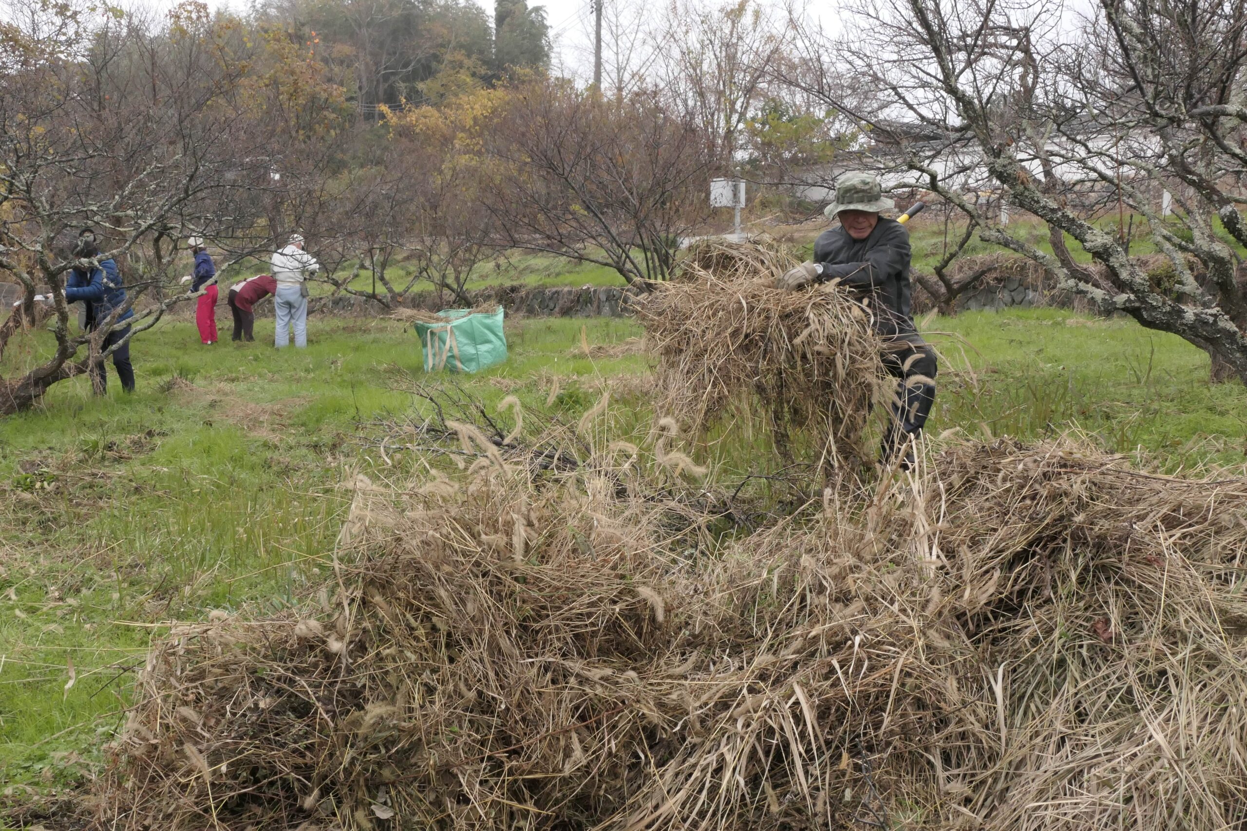 ツタや枯草を集めて清掃に励む住民手分けして梅の剪定に取り組む地域住民ら=岡山県津山市で