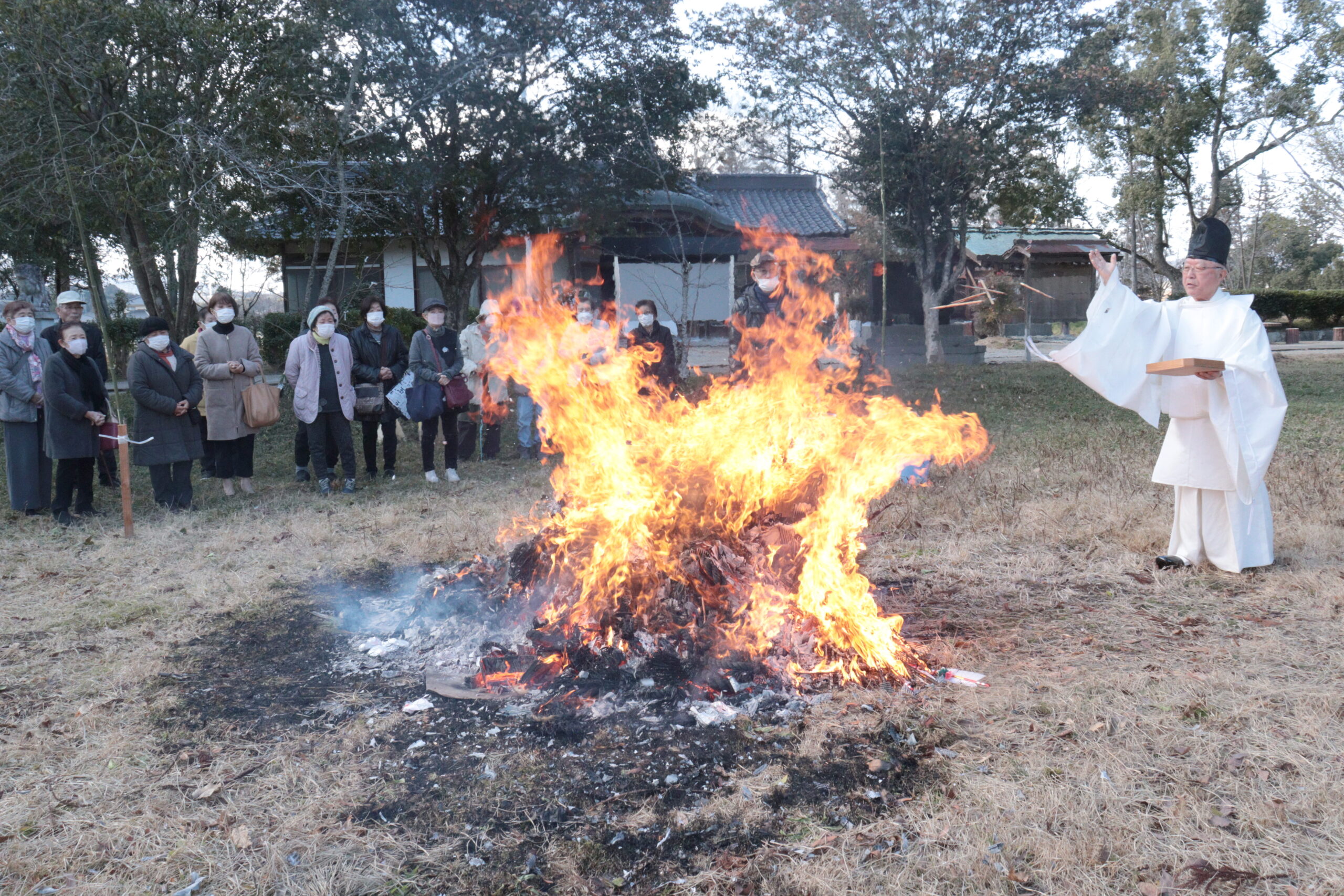 燃え盛る炎に古筆を投げ入れる小坂宮司=岡山県津山市で