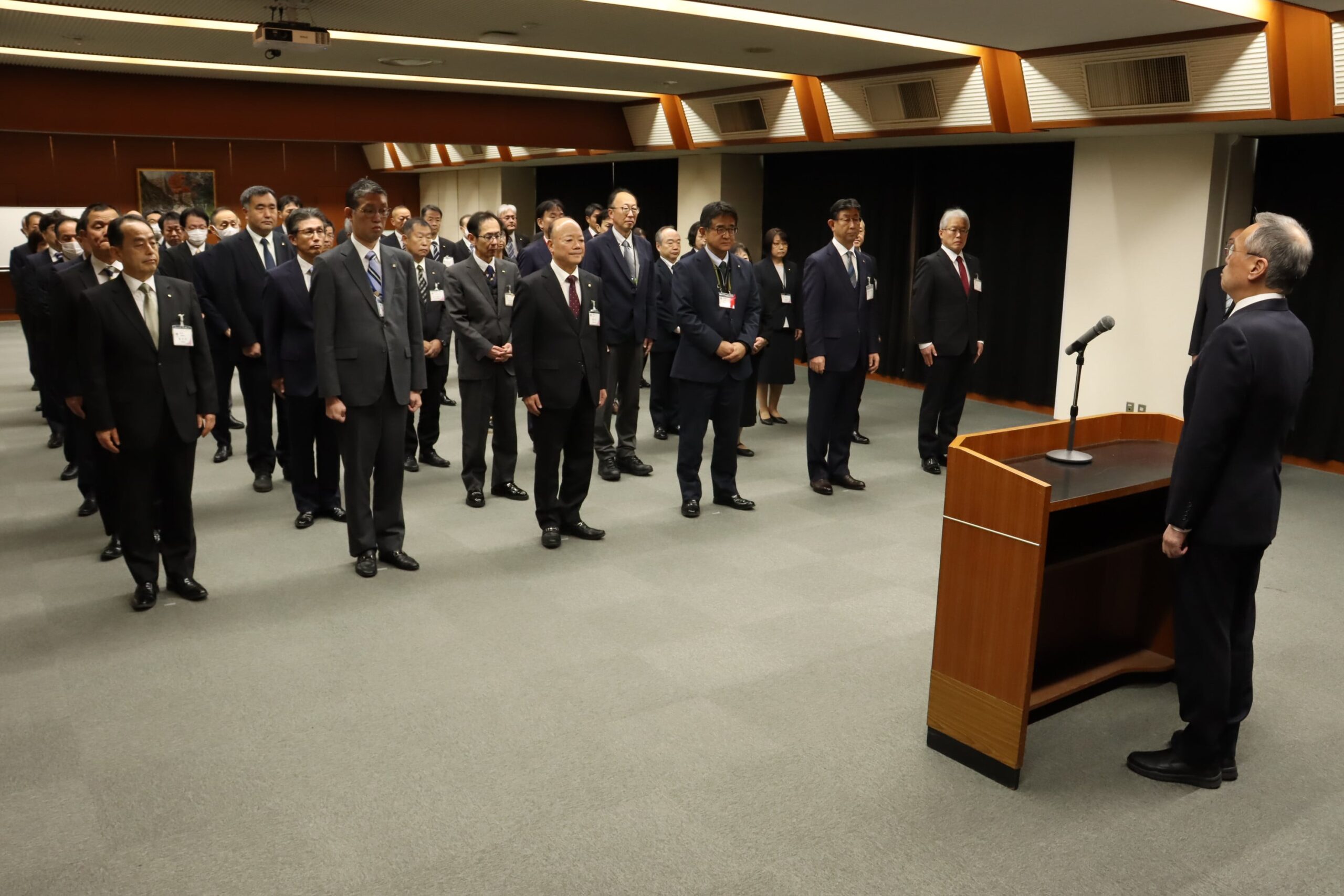 谷口市長の訓示を聞く幹部職員=岡山県津山市で