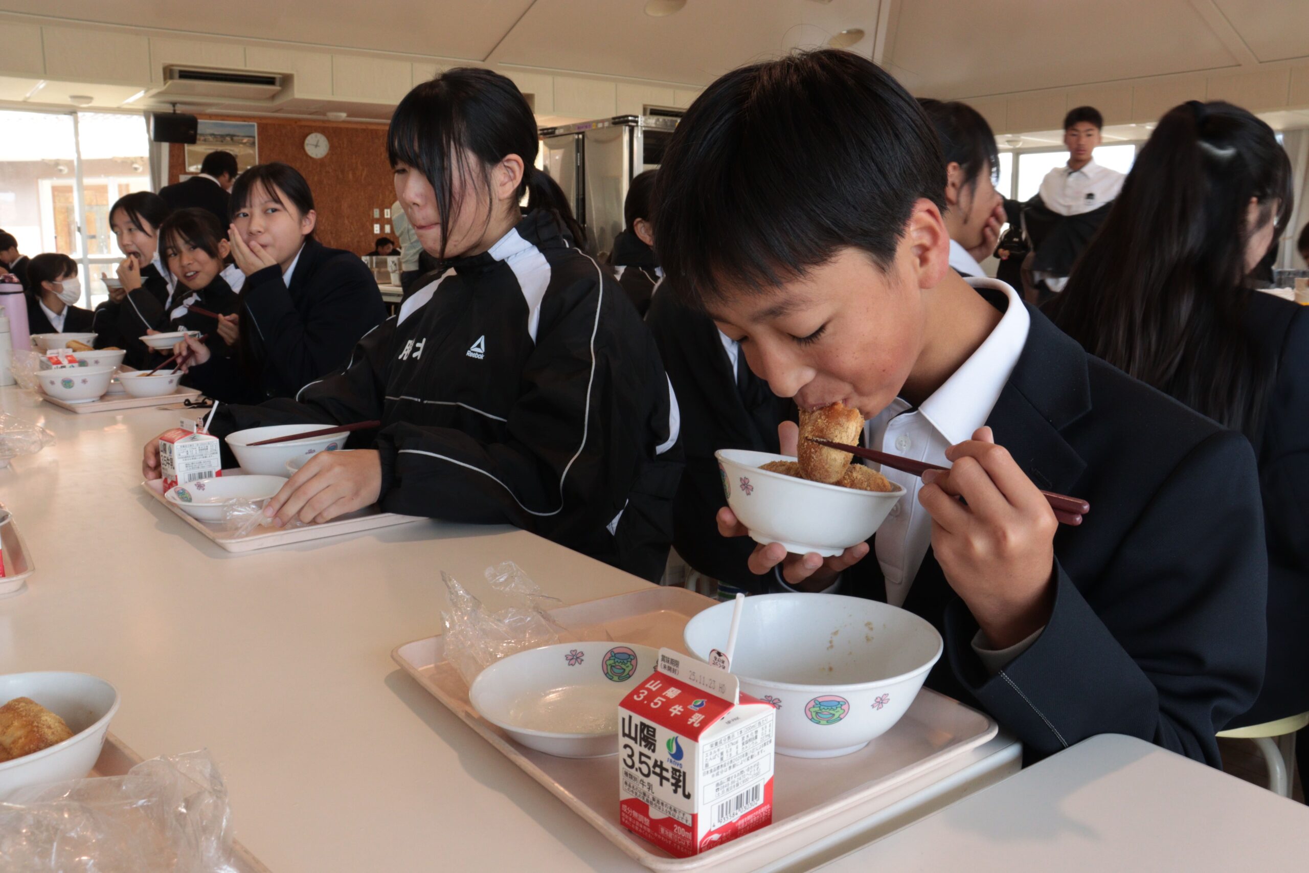 津山産小麦を活用した揚げパンを食べる生徒=岡山県津山市で