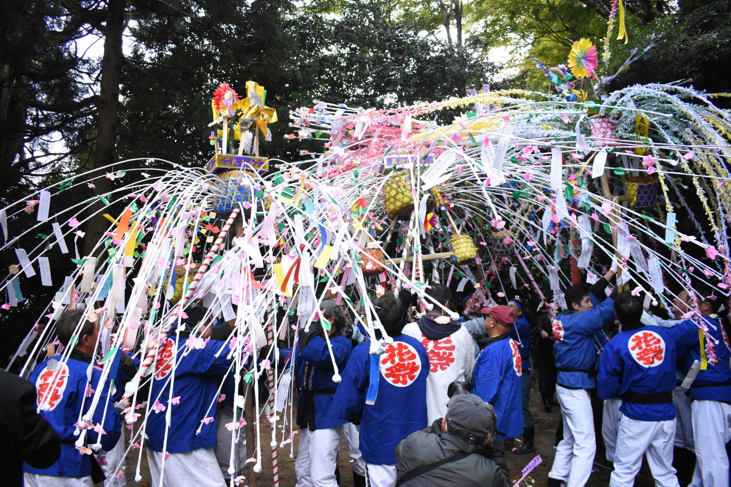 花をぶつけ合う男衆=岡山県津山市で
