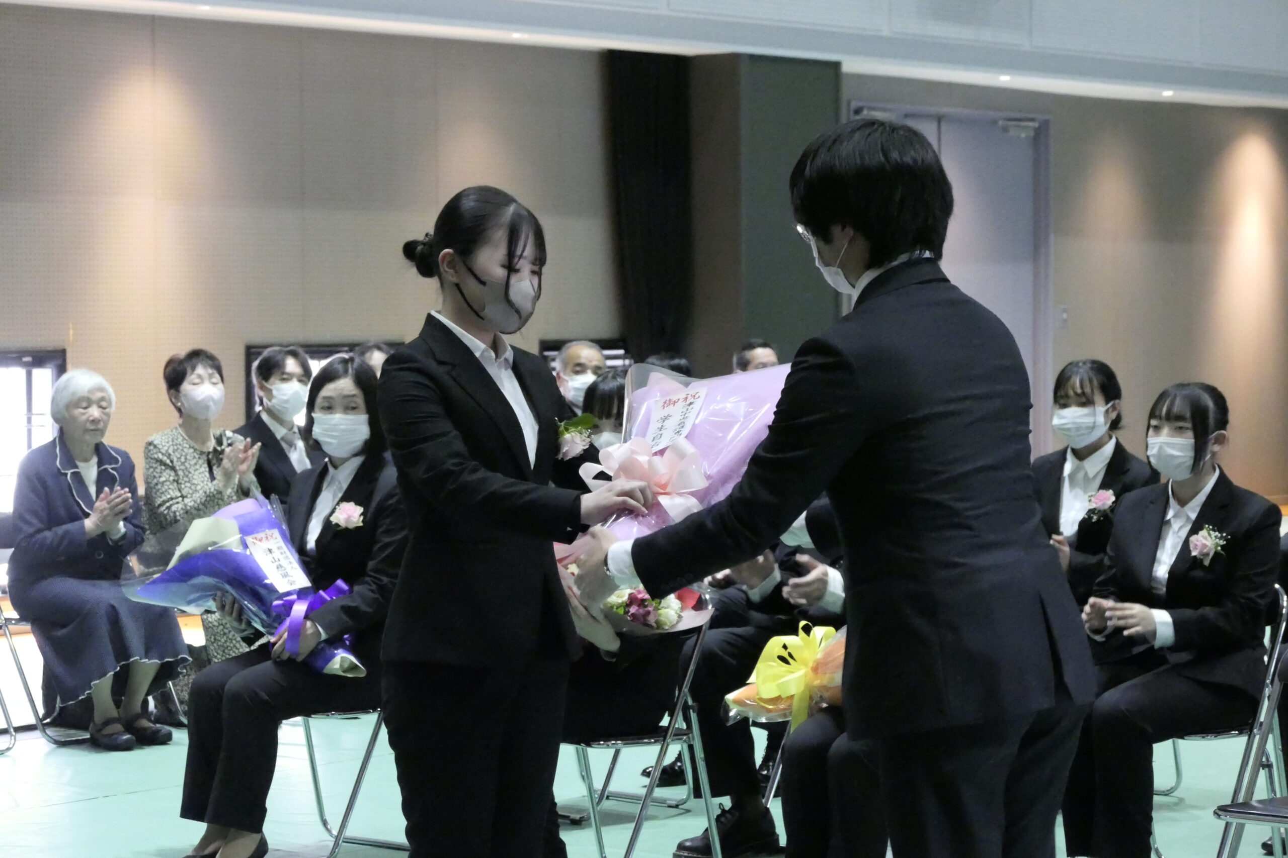 花束を受け取る新入生