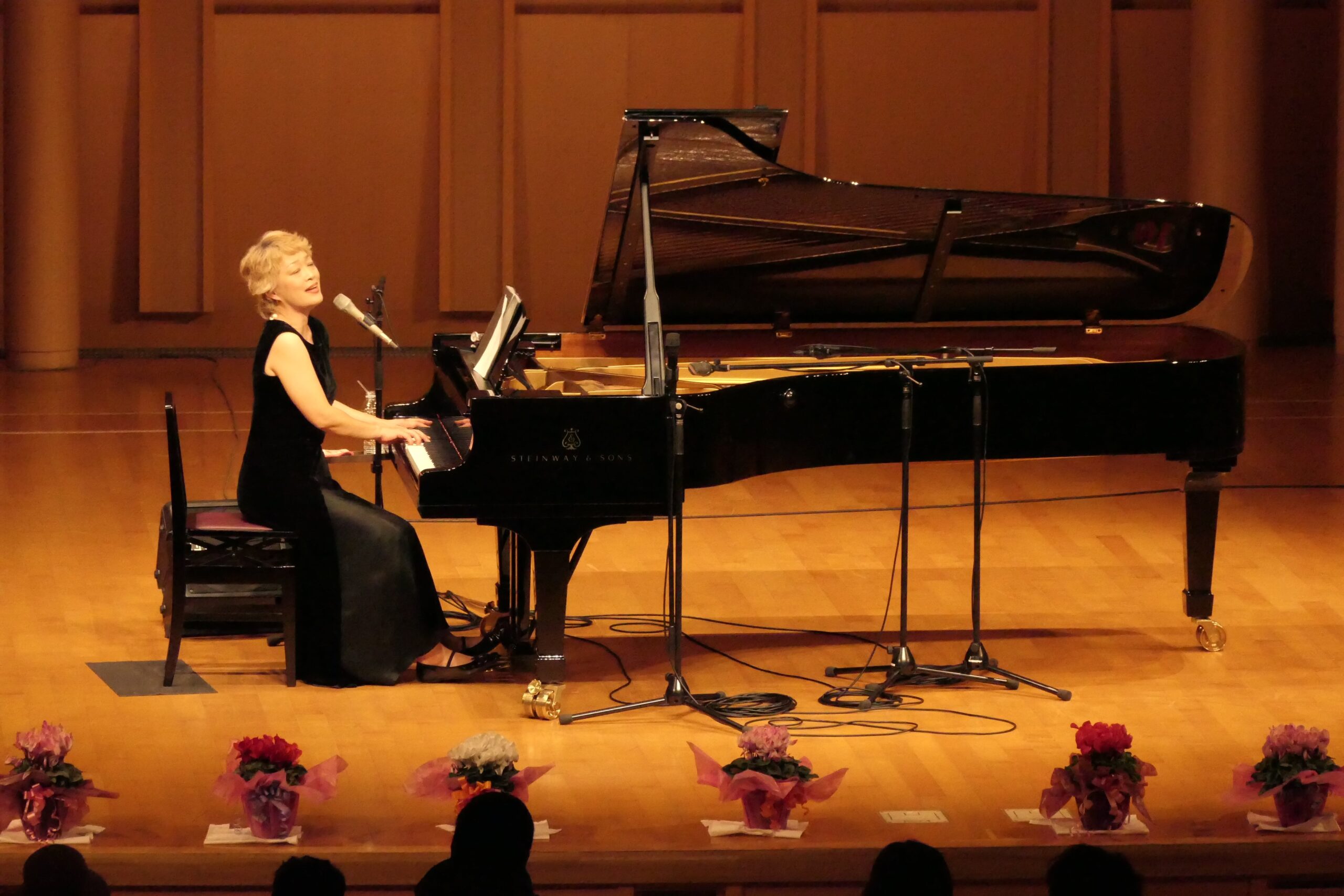 伸びやかな歌声を会場に響かせる沢さん=岡山県津山市で