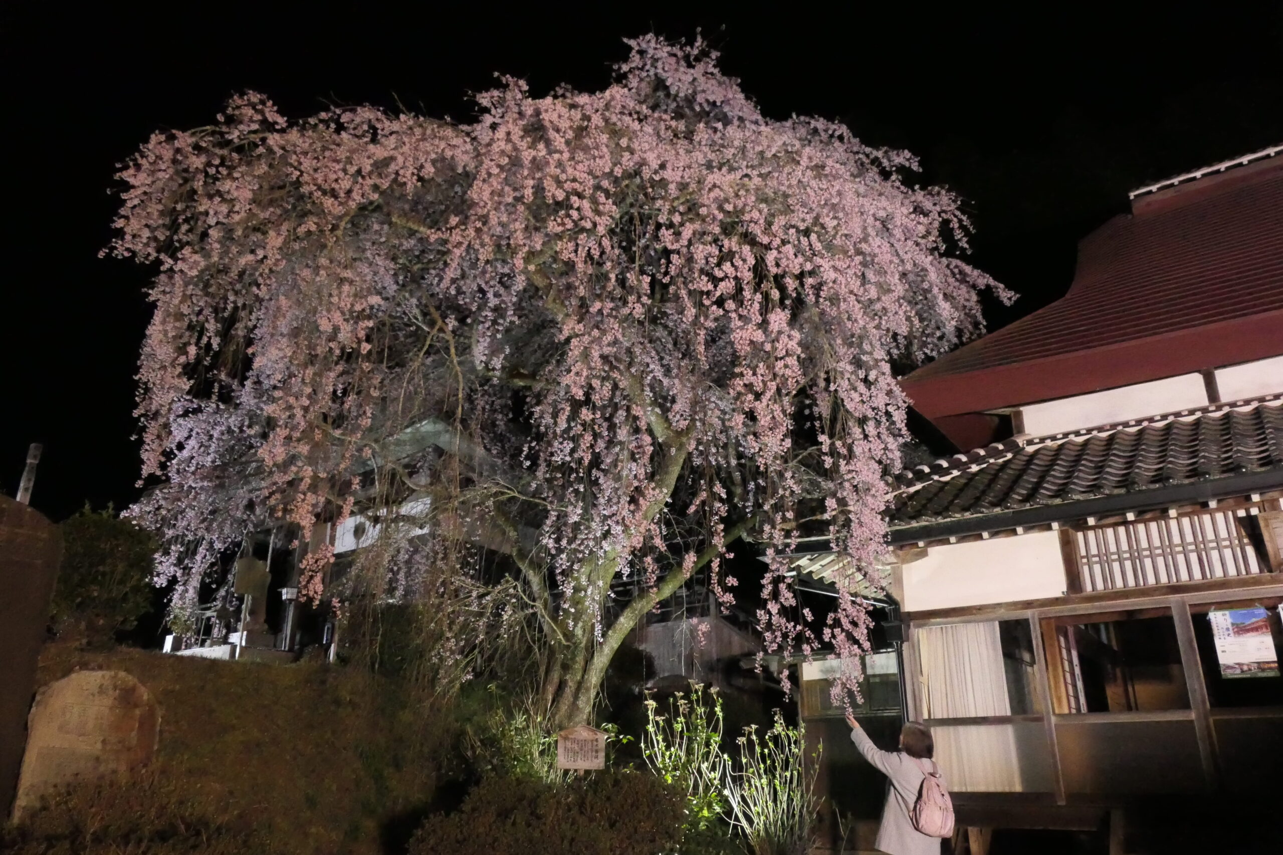光に照らされ幻想的な雰囲気を醸し出す枝垂れ桜=岡山県津山市で