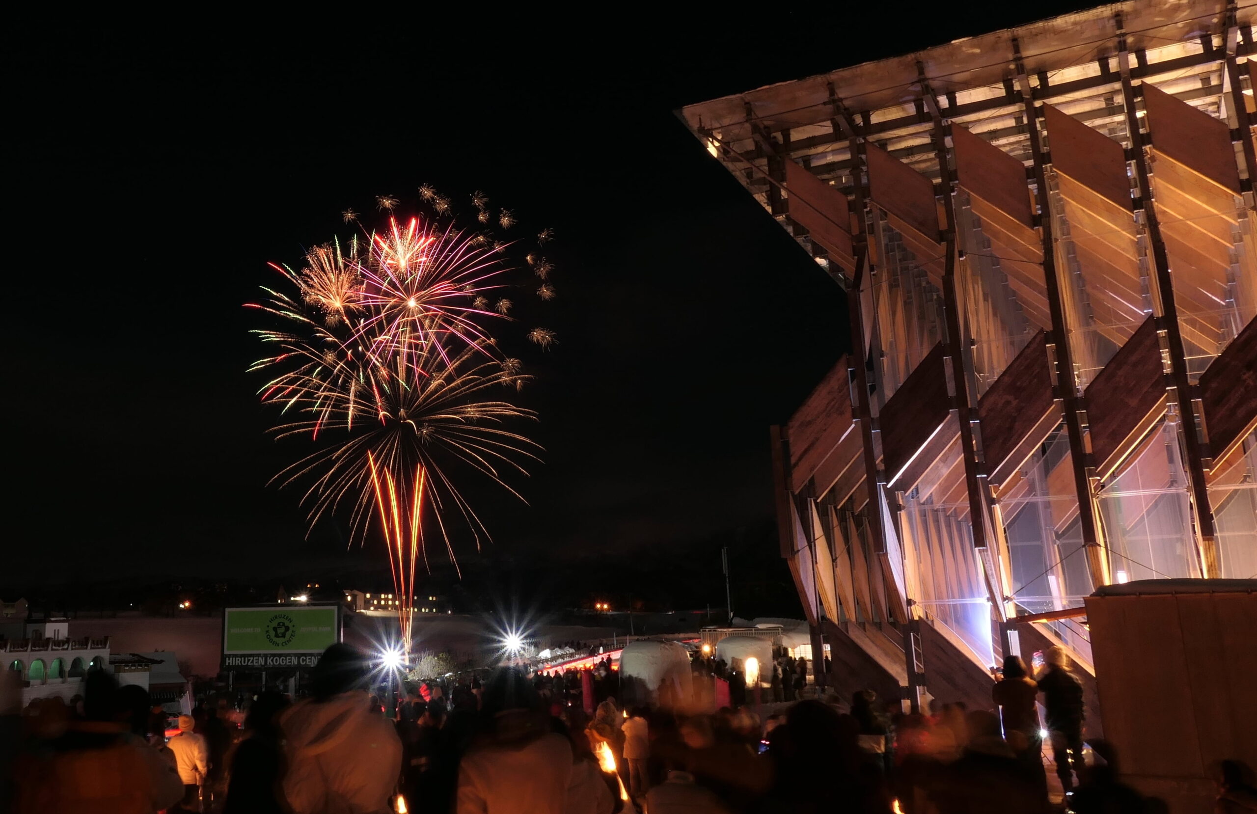 かまくら作りに熱中する子どもたち花火が打ち上がり盛り上がる会場明かりのともったかまくらが並ぶ幻想的な雰囲気の会場=岡山県真庭市で