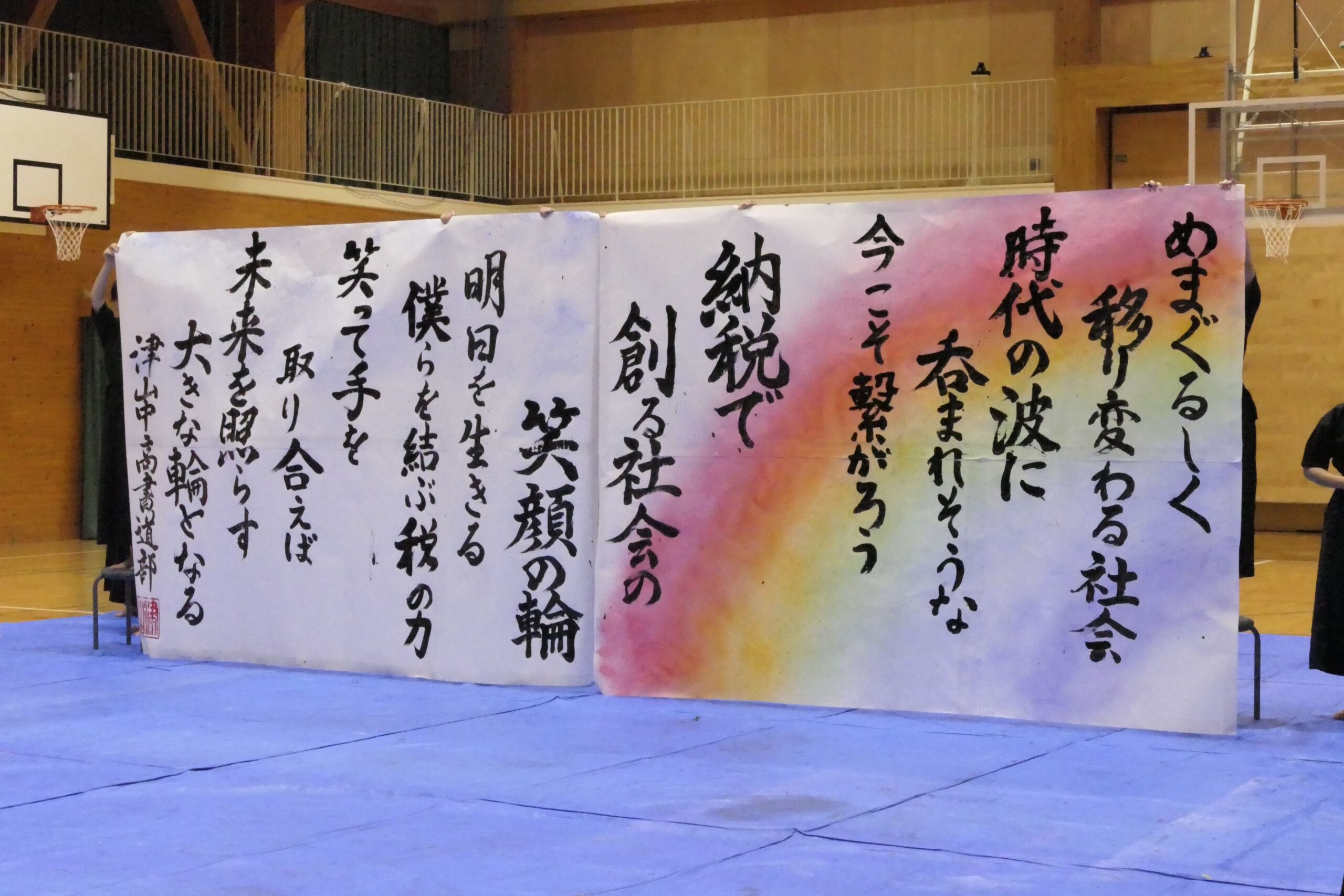 納税への理解深める作品 書道パフォーマンスで完成 津山中学・高校書道部/岡山・津山市