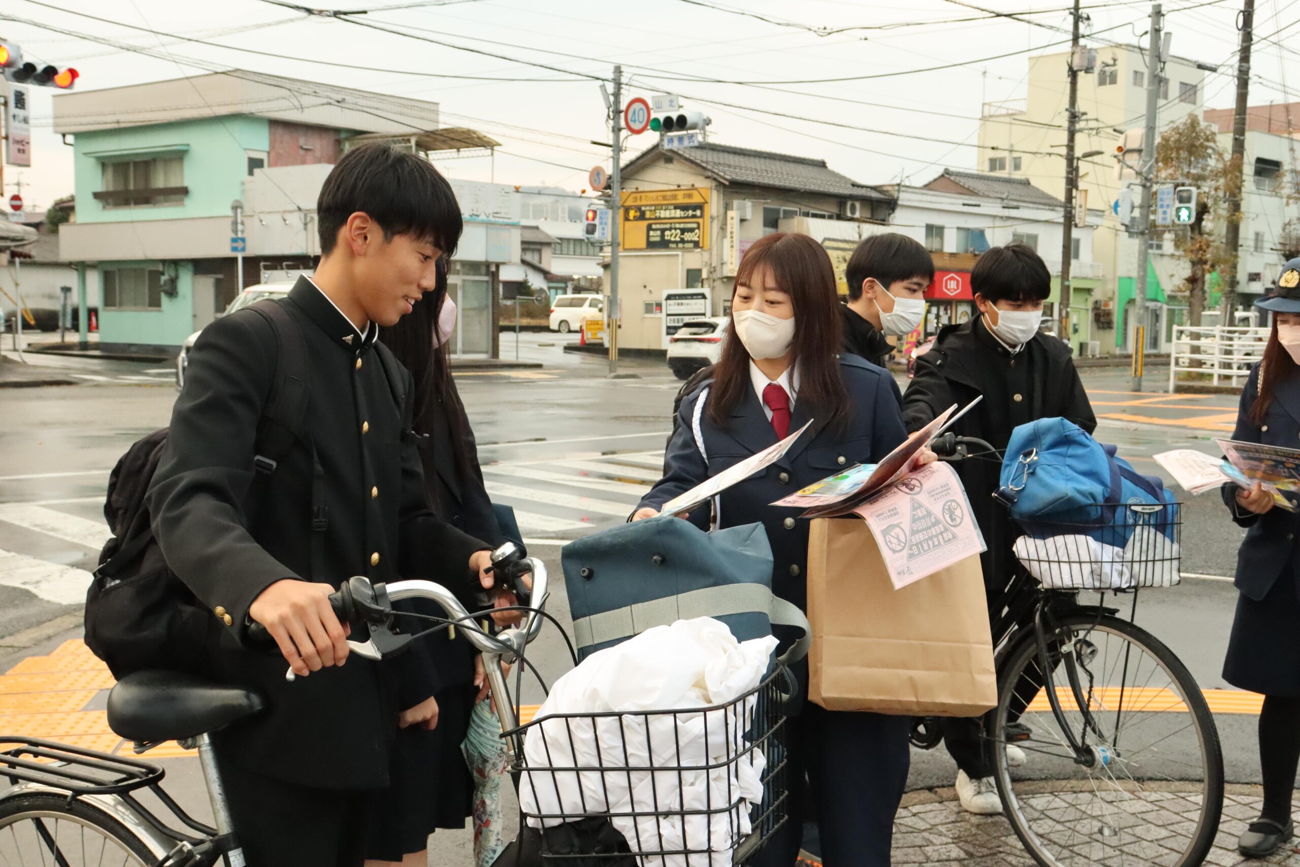 通行者に啓発グッズを手渡す職員ら=岡山県津山市で