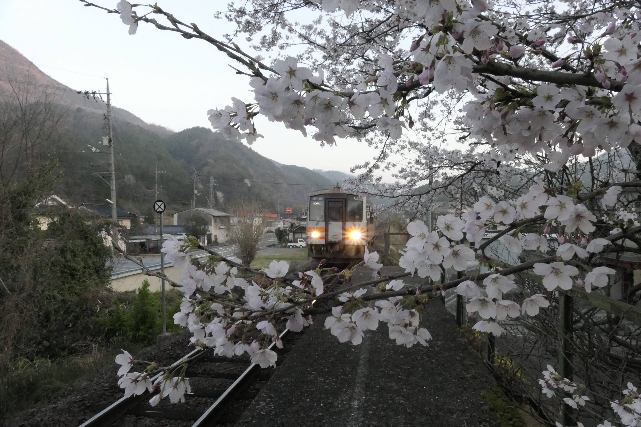 桜が覆う三浦駅に到着する始発列車