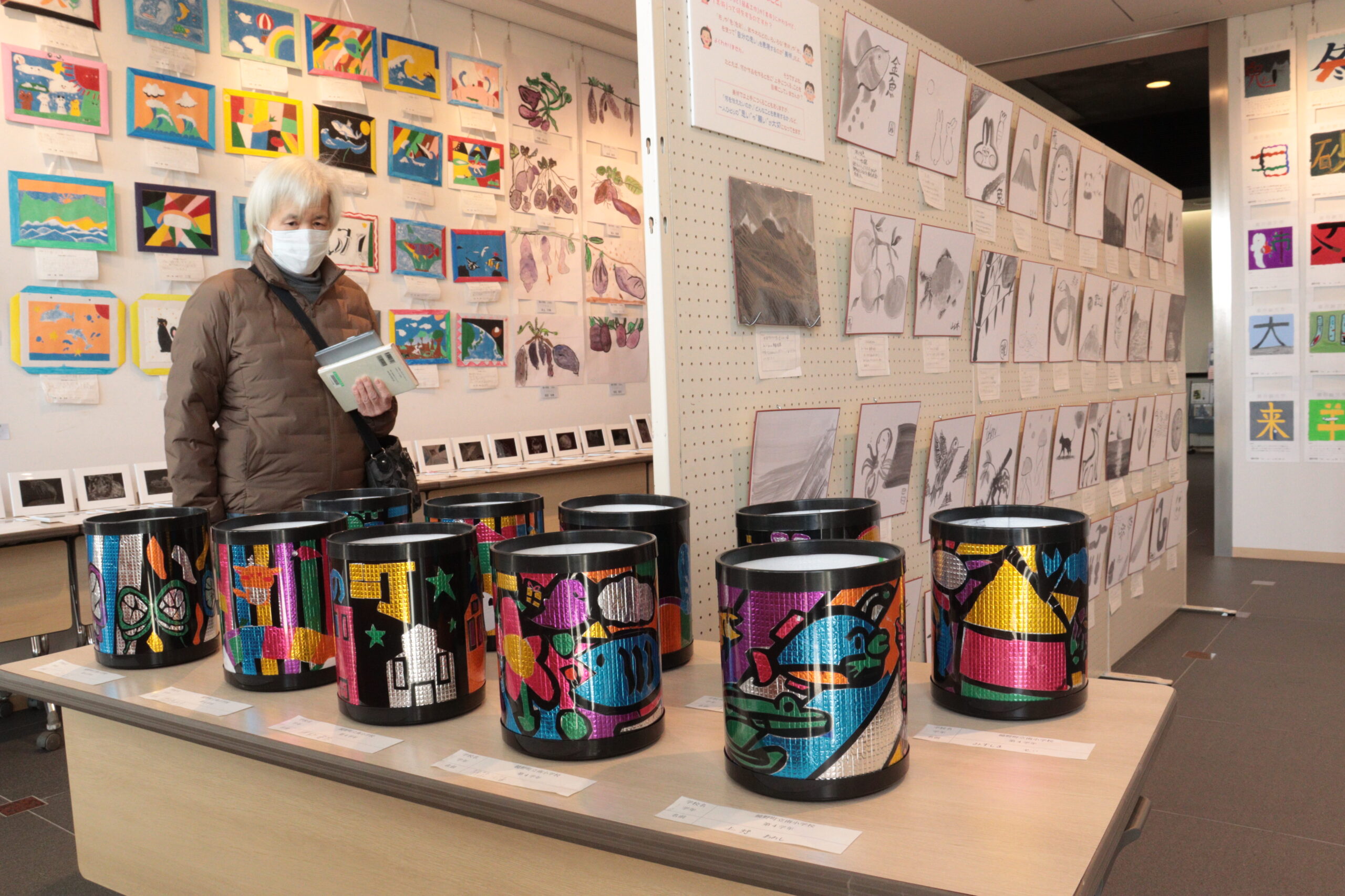 会場に並ぶ子どもたちの多彩な力作=岡山県鏡野町で