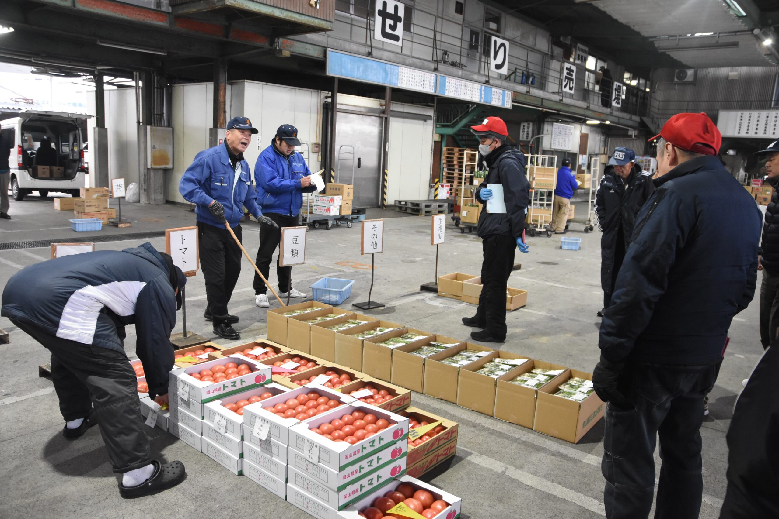 初市の地物野菜を競り落とす仲買人たち=岡山県津山市、津山中央青果で