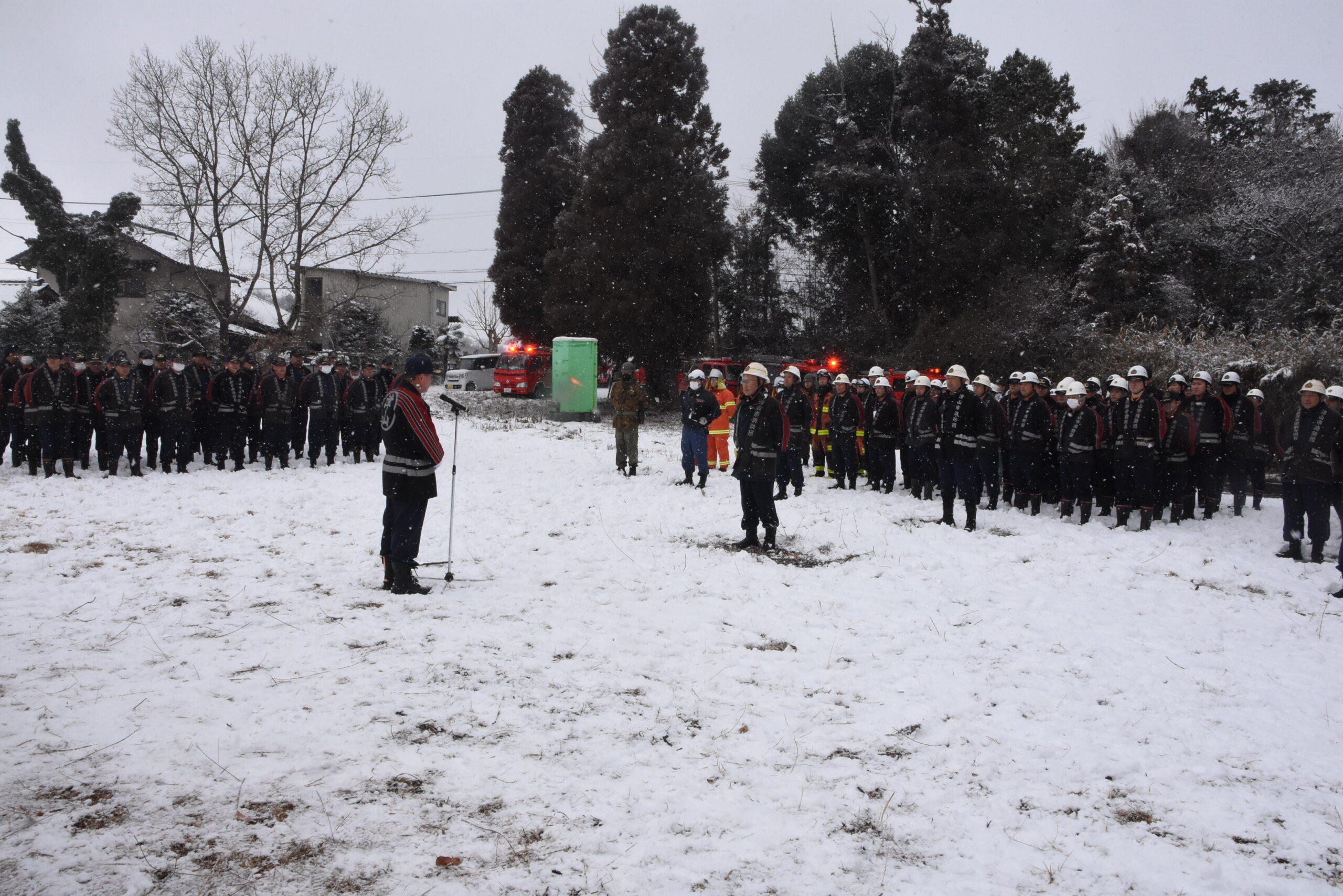 閉会式であいさつする竹内英記団長雪が降る中、消火訓練を行う消防団員=岡山県津山市で