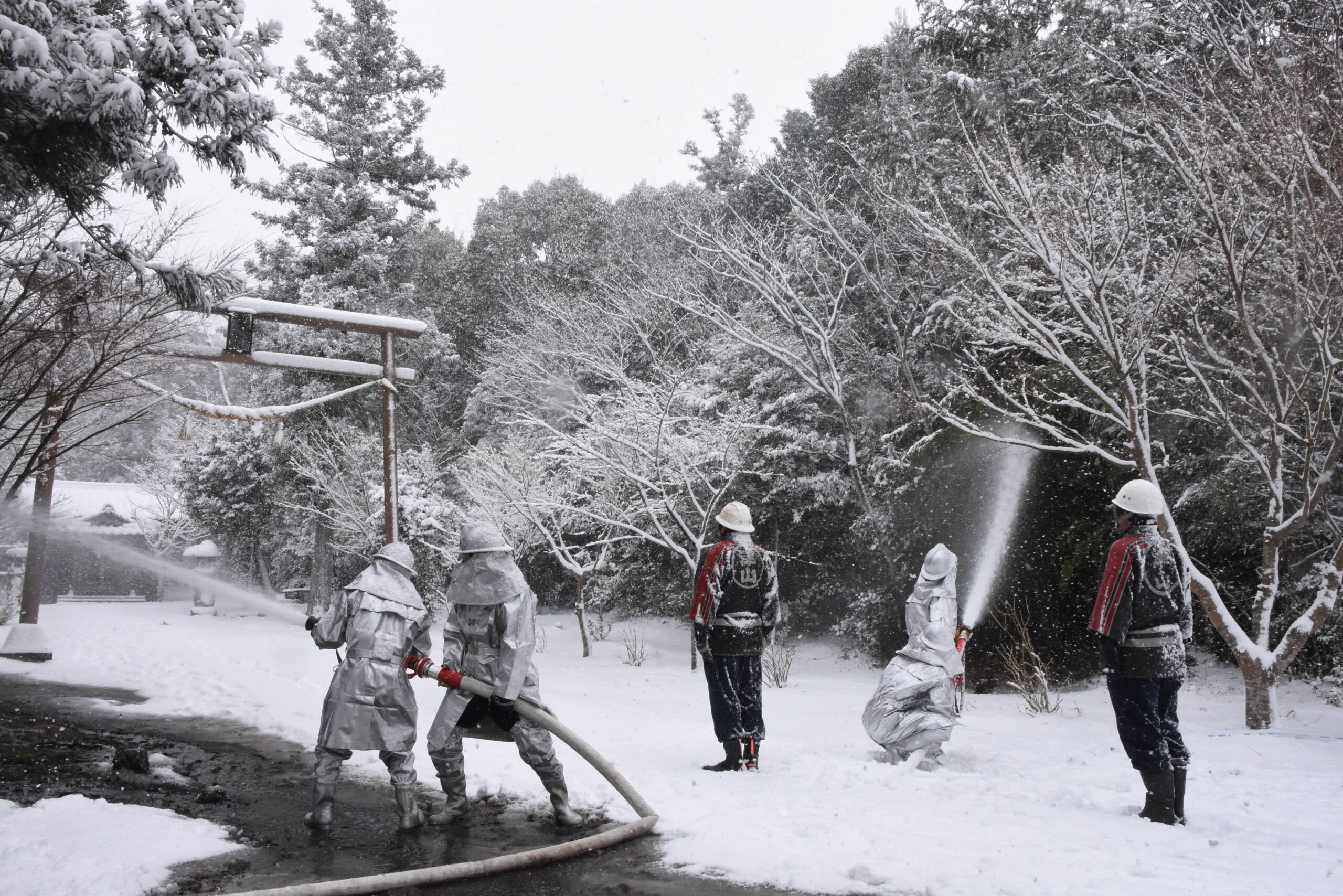 雪が降りしきる中 防火訓練を実施 文化財防火デーに合わせて/岡山・津山市