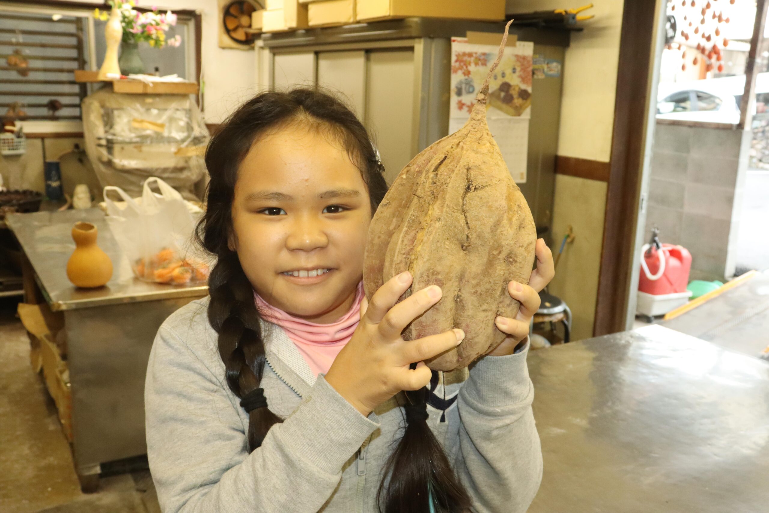 細川さんから大きなサツマイモをもらい喜ぶ松本さん